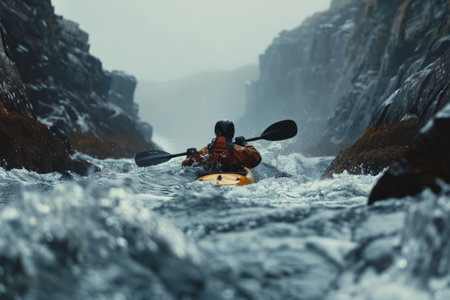 Extreme adventure winter kayaking in antarctica, kayaking tourism in north, kayak between icebergs, AI Generative