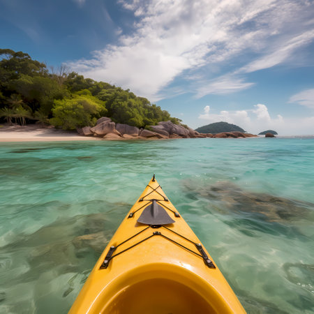 Five vibrant yellow kayaks sit on the shore, gleaming in the bright sunlight. The crystal clear water beckons, inviting you to launch and explore the beautiful surroundings.