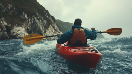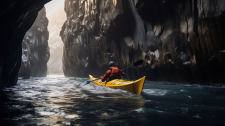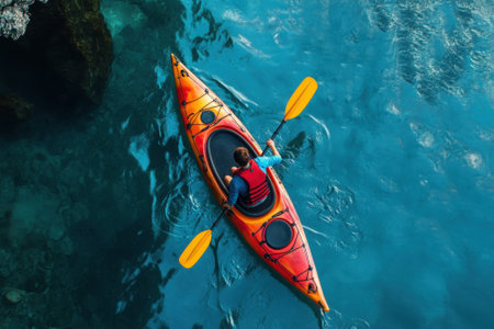 A person in a bright orange kayak navigates through dark, reflective waters. The serene environment highlights the beauty of outdoor adventure and water sports. Generative AI