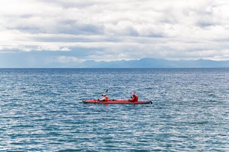 Riding tandem kayak. Double kayak on the sea. Adriatic Sea, Croatia, Europe