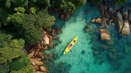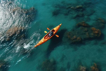 Aerial view of a man in a kayak paddling in the sea, man paddling kayak on tropical island, AI generated