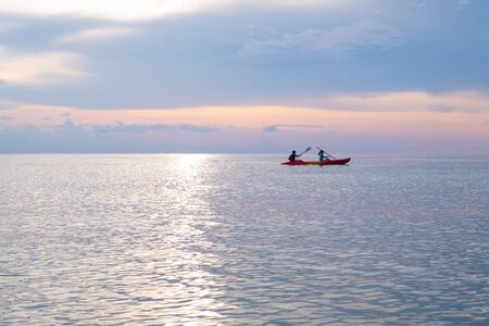 The sea view when the sunset. the clear skies with beautiful clouds. There were young men and women rowing in the middle of the sea.