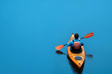 Kayaker paddling an orange boat with an orange paddle on tranquil blue water, promoting solitude and adventure