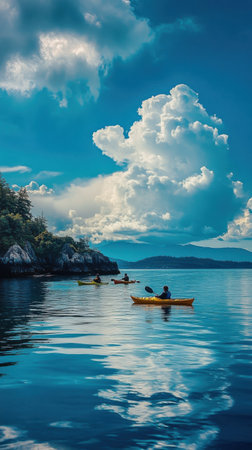 Two kayakers glide across calm waters reflecting a stunning sky filled with fluffy clouds, surrounded by lush green vegetation and distant mountains.
