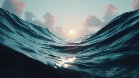 An immersive perspective from the sea surface, looking through a valley of dark blue waves towards a glowing sun setting on the horizon under a soft cloudy sky.