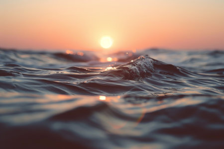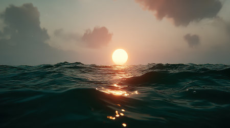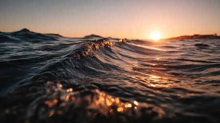 A captivating low angle shot of the sea surface at dusk. The setting sun creates a beautiful golden reflection on the gentle, dark waves, evoking a sense of peace and tranquility.