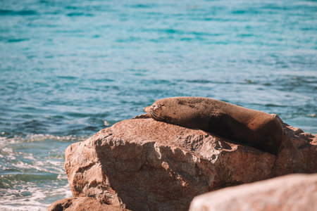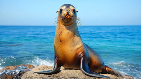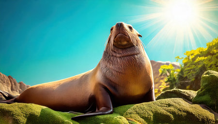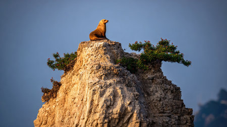 A sea lion sits on a rugged rock formation, illuminated by sunlight. The animal displays a brown coat, contrasting with the light-colored rock and a backdrop of a blue sky. The scene is captured with natural lighting and a wide angle, suitable for diverse uses including wildlife and travel themes.