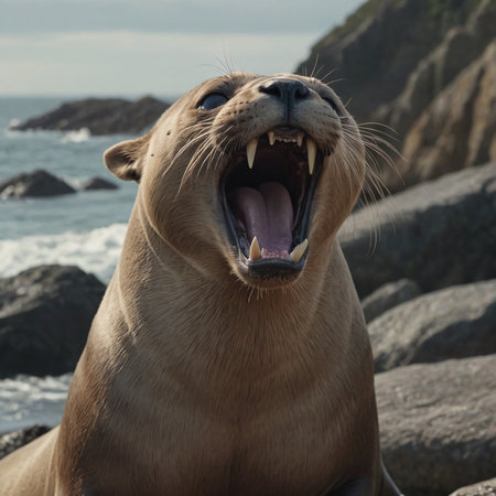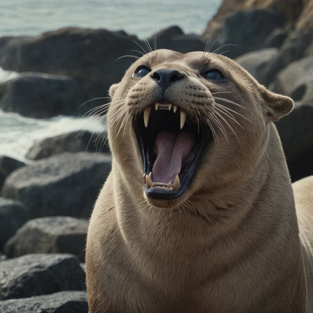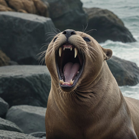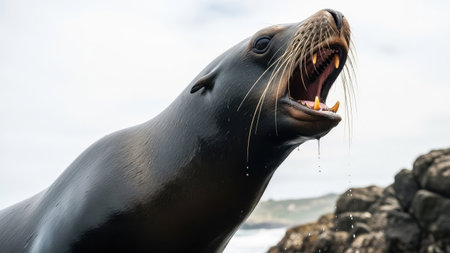 A close-up captures a sea lion, its dark fur contrasting against the pale sky. The animal's mouth is wide open, revealing teeth and whiskers. The lighting appears soft and natural, emphasizing the textures. This image may be suitable for wildlife publications, educational materials, or commercial use.