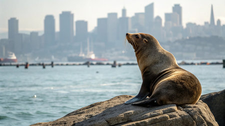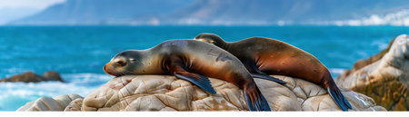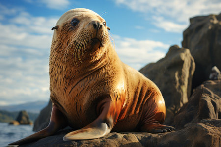A captivating scene of sea lions basking in the sun on rocky shores These marine mammals enjoy the warmth of a sunny day, creating a picturesque moment of wildlife beauty Discover the wonder of nature with stunning images of these playful creatures in their natural habitat AI Generative