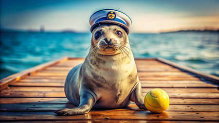 Adorable Seal Captain with Ball on Pier - Cute Marine Animal Stock Photo