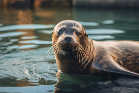 A serene seal basks in the warm glow of sunlight on the water's surface, showcasing its playful spirit against a captivating golden backdrop.