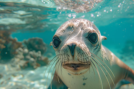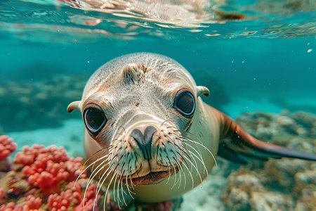 Close up of a sea lion in a coral reef. Aquatic animal.