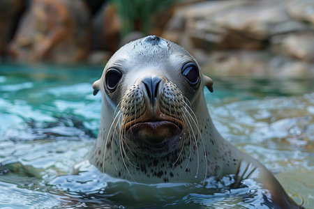 A sea lion is captured in a close-up shot, with visible water droplets spraying from its mouth. The image highlights the animal's dark fur and open mouth. The composition includes a blurred background. Suitable for various editorial and commercial applications related to wildlife and marine life.