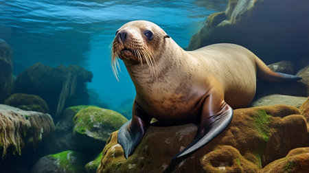 Californian sea lion (Zalophus californianus) posing on a rock in the reefs