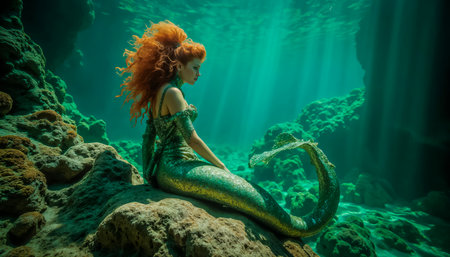 Beautiful red-haired mermaid sitting on a rock. Beautiful mermaid with a tail lives under clear water.