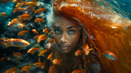 Amazing african american woman with red hair underwater in the ocean with fish.