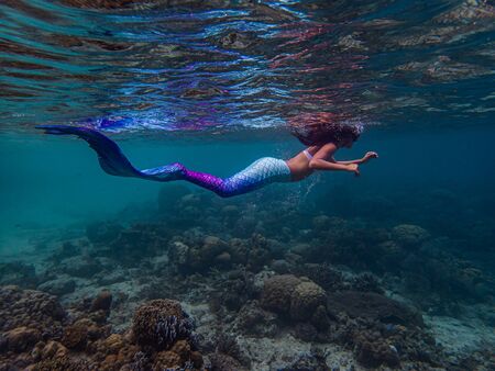 Young female free diver swims underwater in a colorful and sexy mermaid costume.