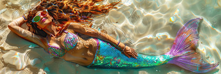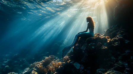 A serene mermaid rests among vibrant coral reefs as sunlight streams through the clear ocean waters Use for fantasy art and nautical themed designs.