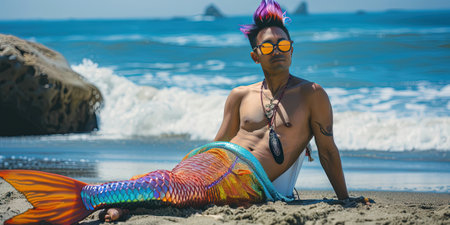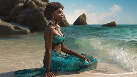 Beautiful african american woman in bikini and sunglasses posing on the beach with mermaid tail.