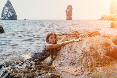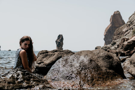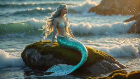 Mermaid resting on a rock by the ocean during sunset with vibrant waves and natural scenery