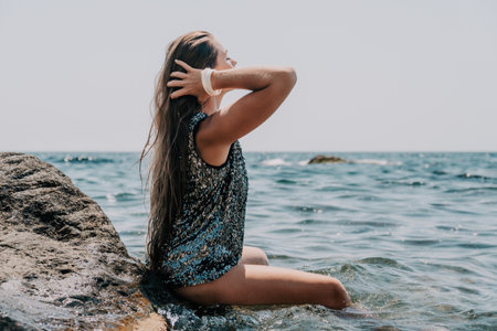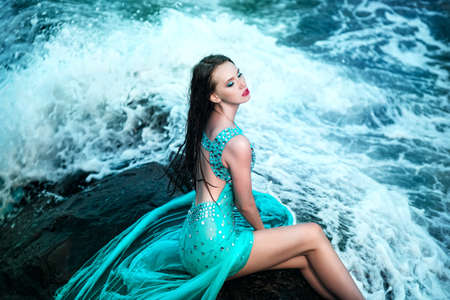 girl with long hair, in a mermaid costume, sits on the rock in the sea