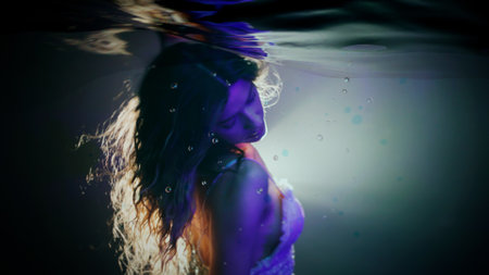 Glamorous underwater portrait, mysterious female face distorted by water surface movement