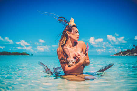Beautiful mermaid in bikini posing on the beach at Maldives