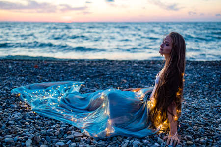 Beautiful long haired woman dressed a mermaid sitting on the sand beach background