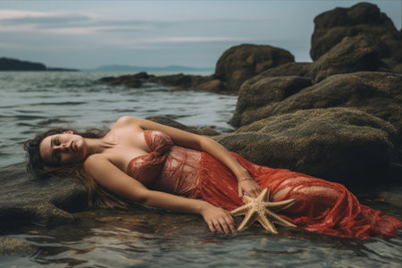 mermaid myth in sunset on beach shore with fish star shells pearls earrings jewelry