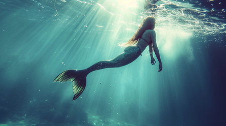 A mermaid swimming gracefully in clear, illuminated waters while beams of sunlight filter through the surface at midday