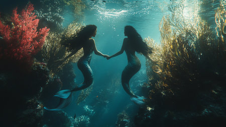 Two beautiful mermaids swimming underwater in the sea. Underwater photo.
