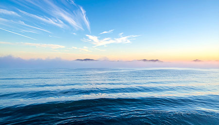 Experience the peaceful beauty of ocean waters under a bright blue sky, where gentle waves create a tranquil scene, enhanced by soft fog on the horizon.