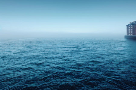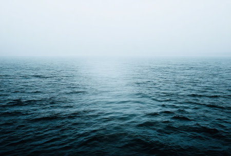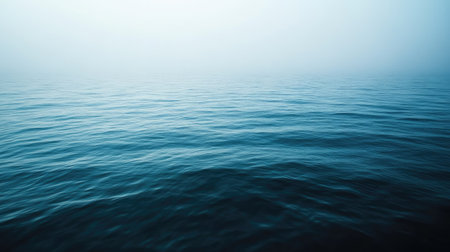 An expansive view of a calm ocean surface under a misty sky. The serene blue tones create a tranquil atmosphere, perfect for relaxation and nature appreciation.