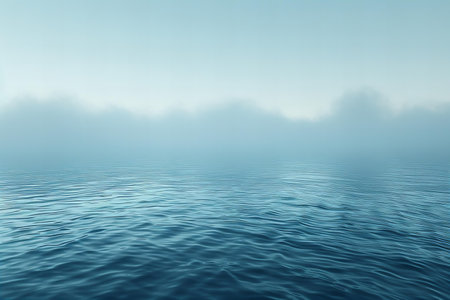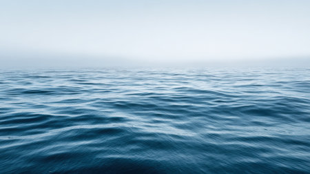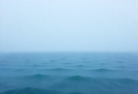 A serene seascape capturing the calm ocean surface with gentle waves under a misty sky in varying shades of blue and gray tones