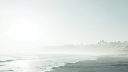 This image captures a serene misty beach landscape at dawn, showcasing gentle waves and a soft horizon. Ideal for evoking tranquility and natural beauty.