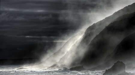 Waves crash against rugged cliffs as an overcast sky looms above. Wind carries sea mist across the coastal landscape.