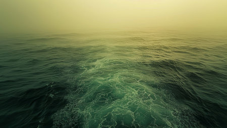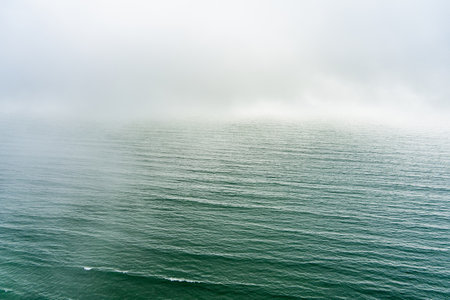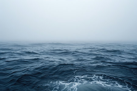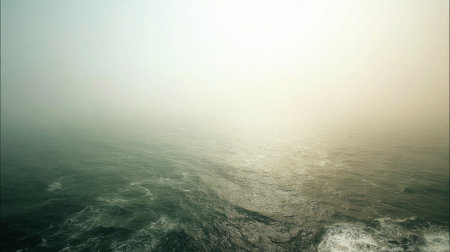 An aerial photograph capturing a vast body of water with strong, crashing waves, Atmospheric representation of a foggy ocean with barely visible waves, AI Generated