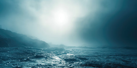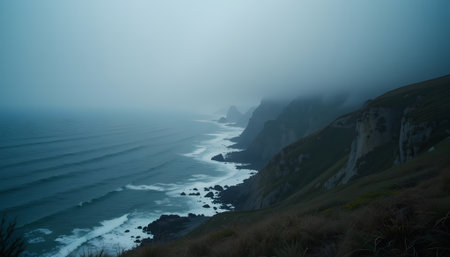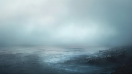 This image captures a serene landscape featuring soft blue ocean waves hidden beneath a gentle mist. Perfect for relaxation and peaceful contemplation.