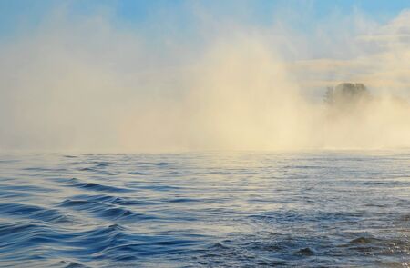 Minimal view of the sea from Helsinki coastline. The weather is so cold that the water freezes and crates a light mist on its surface