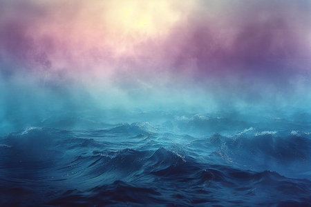 An expansive view of ocean waves illuminated by soft light under a foggy sky, capturing a serene moment, ideal for invoking a sense of calm and tranquility.