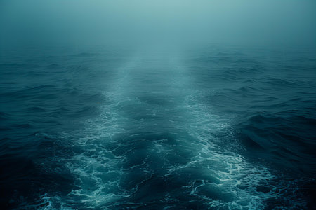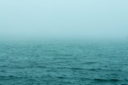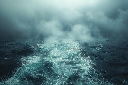 An atmospheric view of a turbulent sea with dark green waves. A dense, bright fog obscures the horizon, creating a mysterious and ethereal mood.