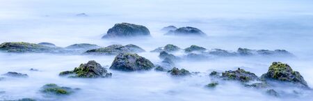 Long exposure of mystery ocean and rocks. Tropical landscape with surreal stones on sea beach. Amazing mystic view of water like fog and mist. Beautiful panorama of magic nature in blue evening.