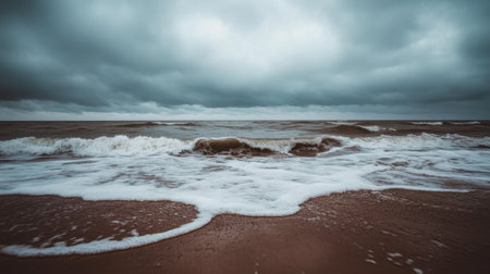 Experience the intense beauty of a stormy ocean landscape, with dynamic waves crashing against the shoreline under dark, brooding clouds.