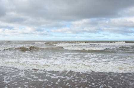 Baltic sea after the storm. Dramatic sky, glowing clouds, soft sunlight. Waves, splashing water. Picturesque scenery, seascape, nature. Panoramic view
