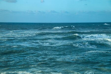 Ocean storm waves dramatically crashing splashing. Sky horizon line. Sea water edge, nature front view marine wallpaper, design. Bad weather cloudy overcast. Dark green turquoise blue tone pale matte