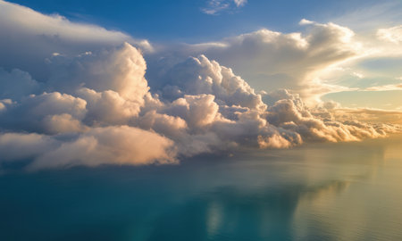 Voluminous cumulus clouds fill the sky above a calm ocean, illuminated by warm golden light during sunrise or sunset, creating a serene and expansive aerial view.