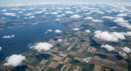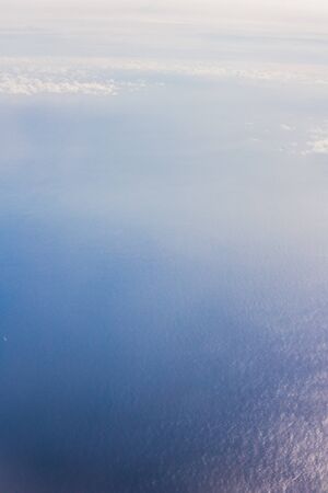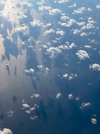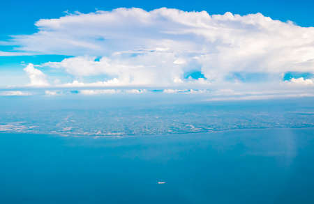 Beautiful view from window of plane flying over white clouds, sea surface and island. Natural panorama with clouds. White clouds moving above water surface of sea and land. Landscape with sea surface