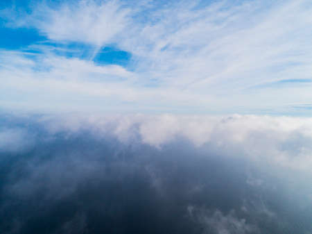 Aerial view White clouds in blue sky. Top view. View from drone. Aerial bird's eye view. Aerial top view cloudscape. Texture of clouds. View from above. Sunrise over the sea