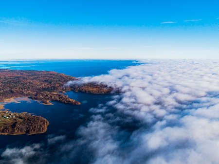 Aerial view over forest during vibrant autumn colors. Aerial view of seashore and clouds. Coastline with sand and water. Aerial drone view of forest. Aerial top view cloudscape. Texture of clouds.