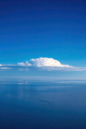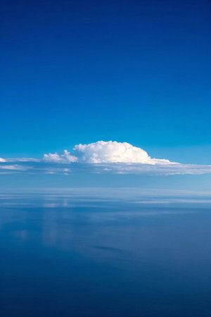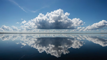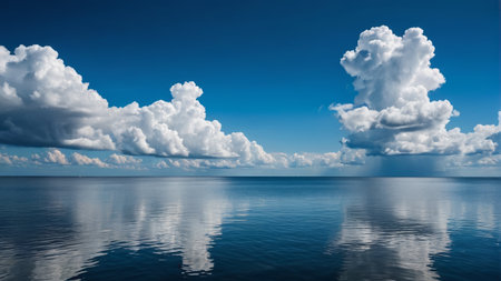Serene scene of calm ocean waters reflecting a sky filled with puffy, white, and grey clouds